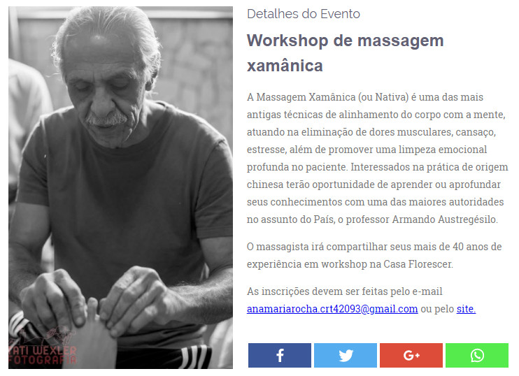 O massagista irá compartilhar seus mais de 40 anos de experiência em workshop na Casa Florescer, em São Vicente, na próxima segunda-feira (23/09), das 19 às 21 horas. As inscrições devem ser feitas pelo e-mail anamariarocha.crt42093@gmail.com ou pelo site institutoflorescerxamanico.com.br/contato e a taxa de inscrição custa R$ 60,00.