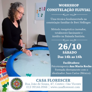 Acontecerá por meio de uma vivencia prática a apresentação da constelação fluvial e como ela poderá ser trabalhada nas questões que serão colocadas pelos participantes.
